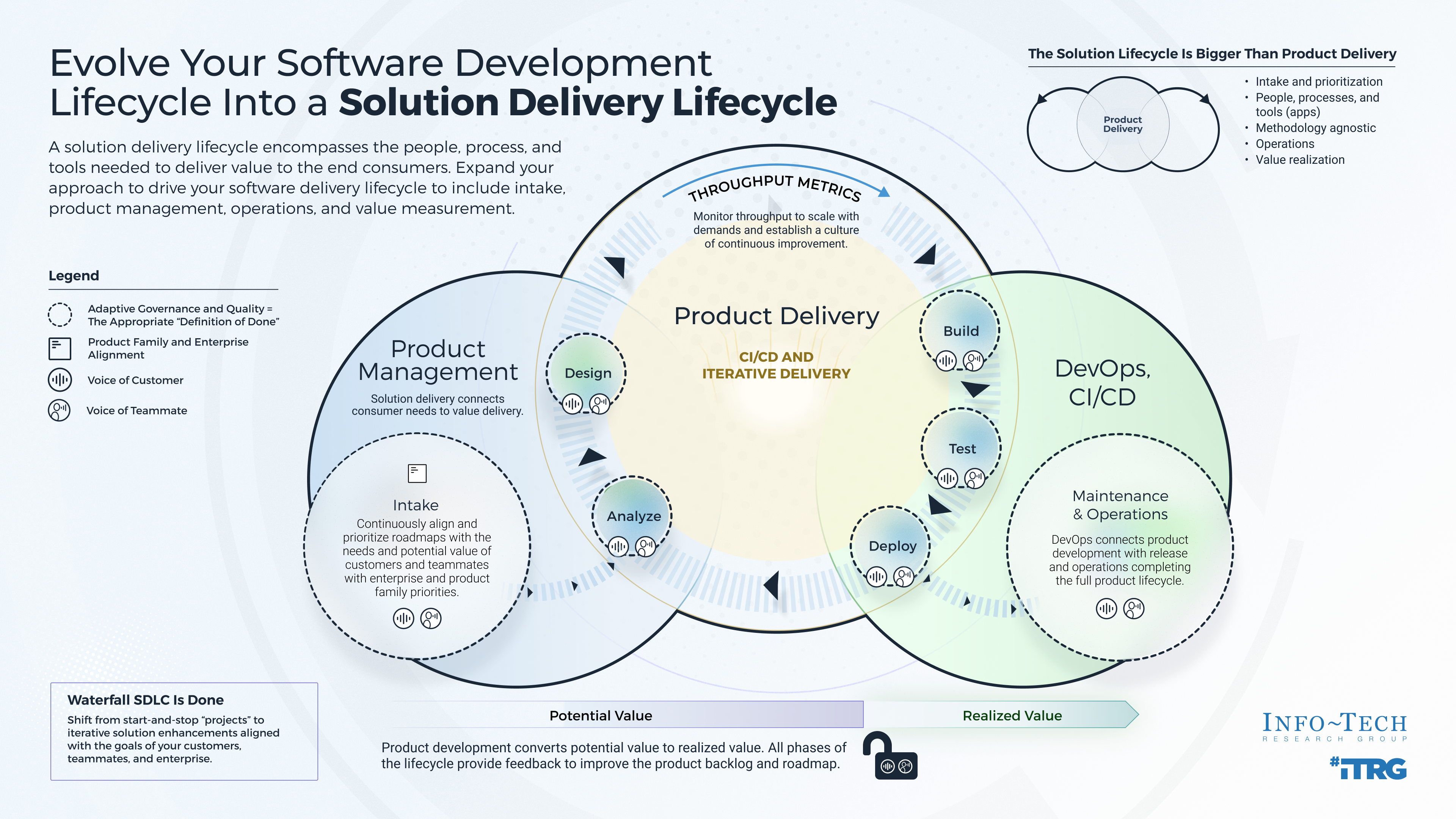 A solution delivery lifecycle encompasses the people, processes, and tools needed to deliver value to the end consumers of the solution. Expand your approach to drive your software development lifecycle (product delivery) to include intake, product management, operations, and value measurement.